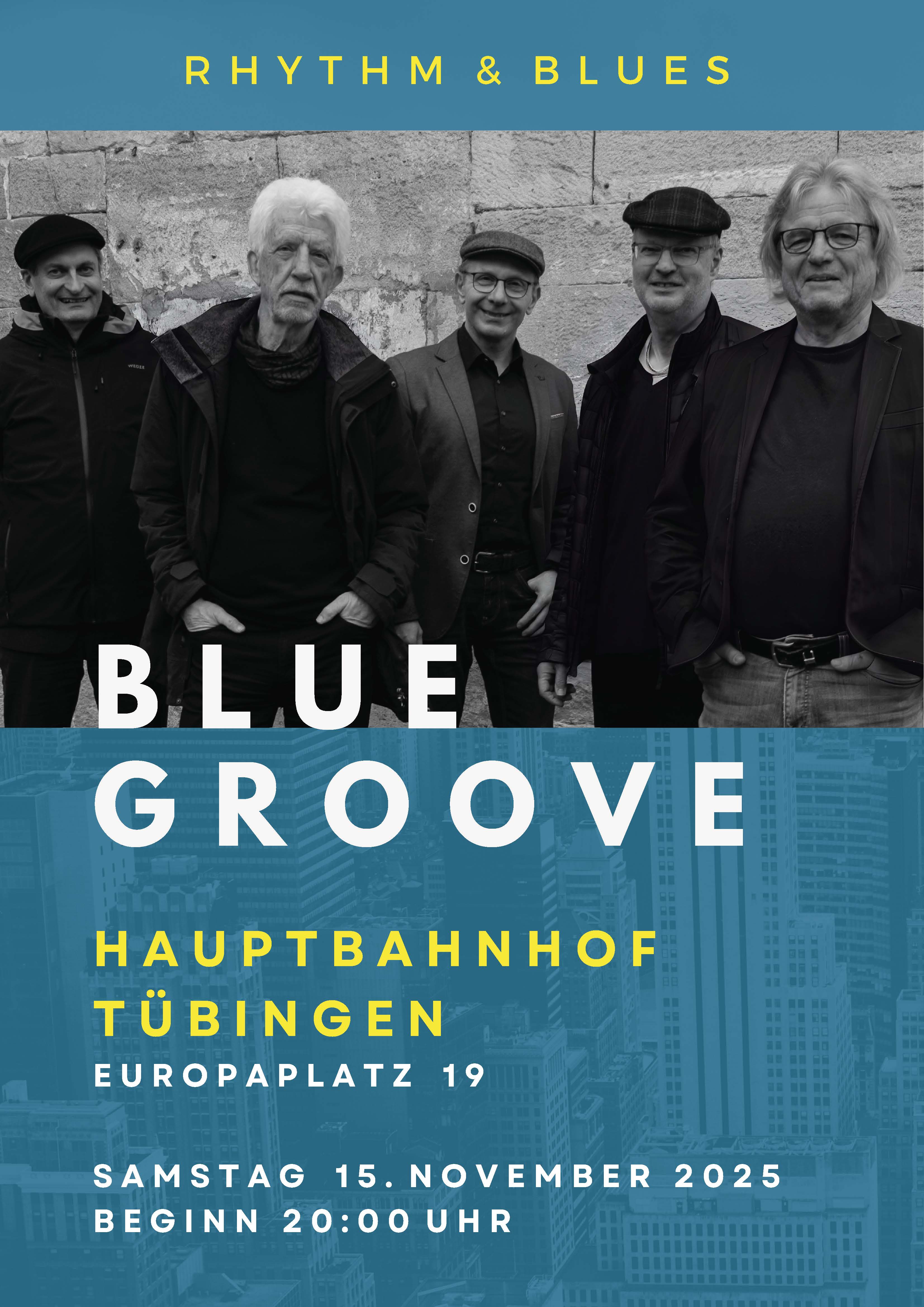 Samstag, 15.11.2025 Wenn du auf swingenden und pulsierenden Rhythm & Blues stehst, dann wird dir die Musik von Blue Groove mit Sicherheit gefallen. Da ist alles drin — Blues, Soul, Swing, New Orleans Groove und ein Schuß Rock‘n‘ Roll. Blue Groove, das sind der Gitarrist Martin Kade aus Owen mit der sonoren Blues-Stimme, Bernd Schwarz, ein versierter Harpspieler und Sänger aus Heilbronn, Stefan Zenner aus Stuttgart, der gekonnt die schwarzen und weißen Tasten bedient, der Plochinger Tieftonspezialist Michael Paul Faulhaber am Kontrabass und, last but not least Günter Schulz Reinfurt aus Downtown Wendlingen am Schlagzeug, der den Groove routiniert am Laufen hält. Für ihr Programm hat sich die Band hauptsächlich Songs von eher unbekannteren Rhythm & Blues Künstlern ausgewählt, die sie mit Spielfreude und einer guten Prise Humor zum Besten geben. Weitere Informationen: